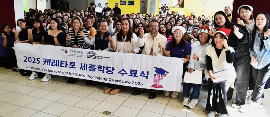 El rector de la Universidad Tecnológica de Querétaro (UTEQ), Luis Fernando Pantoja Amaro, encabezó la ceremonia de clausura del curso de idioma y cultura coreana del Instituto Rey Sejong (IRS) Querétaro, en el periodo septiembre-diciembre 2025, entregando certificados a más de 150 alumnos que concluyeron sus estudios en el aprendizaje del idioma en los niveles: 1a y b, 2a y b, así como 3a y b.