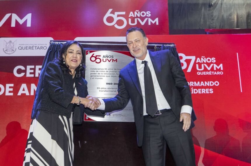 En el marco de los festejos por el 65 aniversario de la Universidad del Valle de México, el gobernador, Mauricio Kuri González, en compañía de la presidenta del Sistema Estatal DIF, Car Herrera, encabezó la ceremonia conmemorativa alusiva a los 37 años de legado de la UVM, campus Querétaro; institución que, dijo, contribuye de manera fundamental al liderazgo que tiene la entidad resultado de su sistema educativo robusto, su enfoque multicultural, y sus programas innovadores e inclusivos.