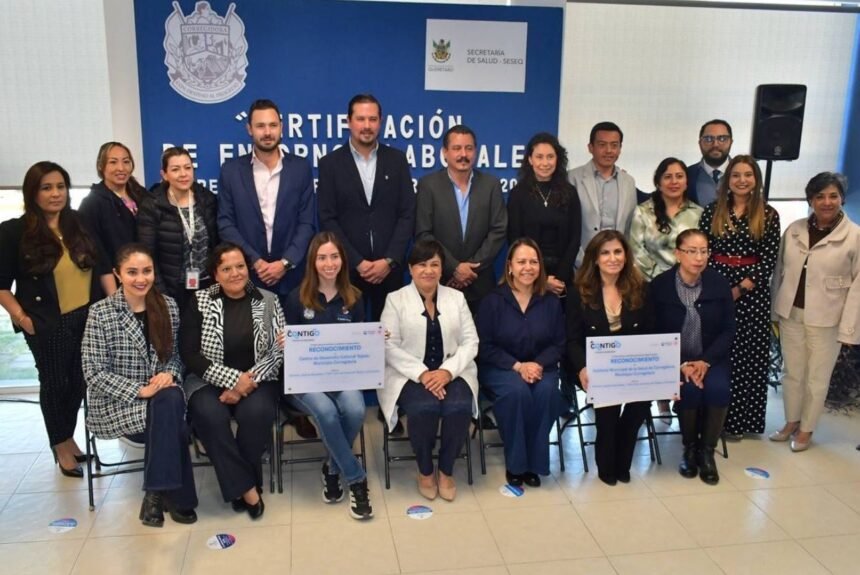 La titular de la Secretaría de Salud (SESA) del estado de Querétaro, Martina Pérez Rendón, encabezó la ceremonia de entrega de placas que acreditan la certificación de dos edificios del municipio de Corregidora como Entornos Laborales Saludables y 100 por ciento Libres de Humo de Tabaco. Estos reconocimientos reflejan el compromiso institucional de impulsar acciones orientadas a la protección, promoción y fortalecimiento de la salud y el bienestar de las y los trabajadores.