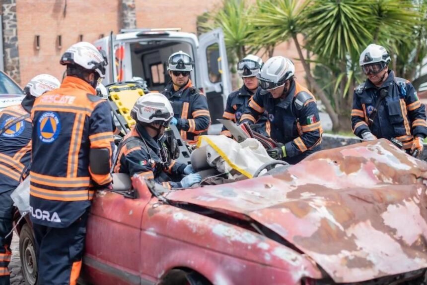El simulacro incluyó tres escenarios especiales: el rescate de un ciudadano atrapado en un vehículo con daños estructurales utilizando herramientas electrohidráulicas de alta especialización; un rescate en altura con técnicas de cuerdas, poleas y arneses; y la simulación de un incendio de vehículo controlado con extintores y tanques de agua a presión.