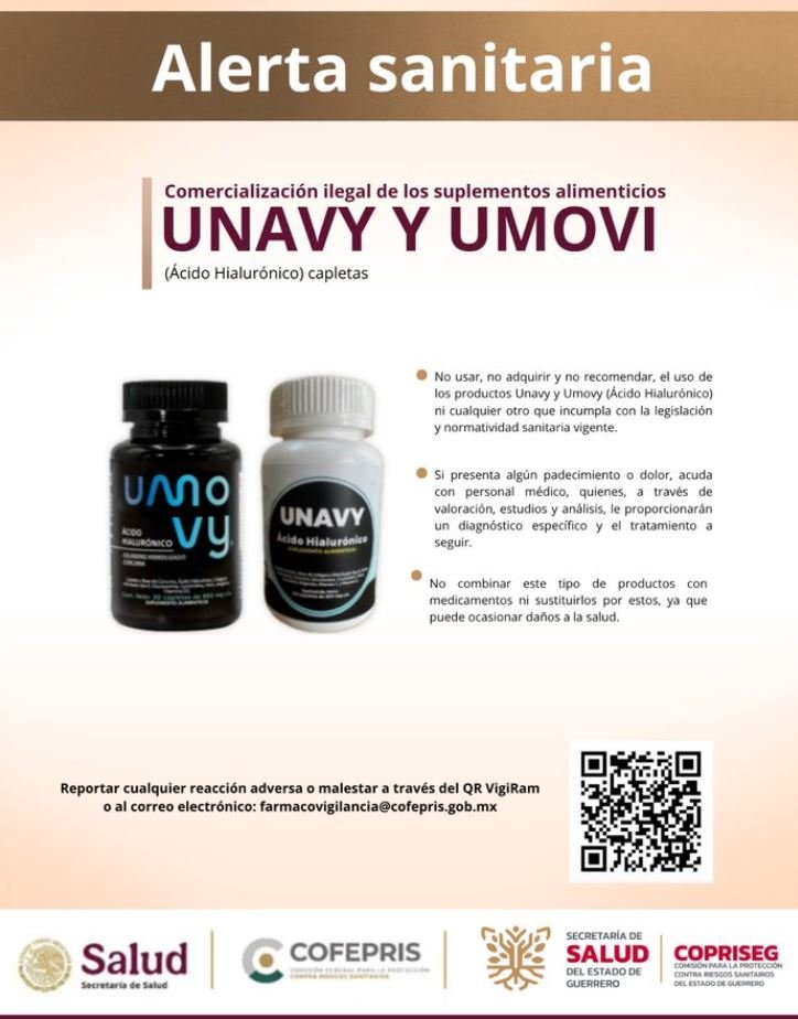 La Secretaría de Salud (SESA) del estado de Querétaro informa que la Comisión Federal para la Protección contra Riesgos Sanitarios (COFEPRIS) emite una Alerta Sanitaria sobre la comercialización ilegal de los productos de las marcas Unavy y Umovy (Ácido Hialurónico), “suplementos alimenticios”, los cuales se promocionan en plataformas de comercio electrónico, sitios web y aplicaciones de dispositivos móviles para el dolor y artritis.