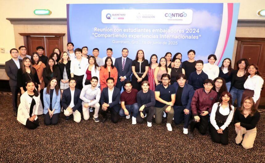 Estudiantes unversitarios que fueron beneficiados con el programa estatal Beca Embajadores 2024 compartieron sus experiencias internacionales con la secretaria de Educación del Estado de Querétaro (SEDEQ), Martha Soto, así como con diversas autoridades educativas y otros universitarios.