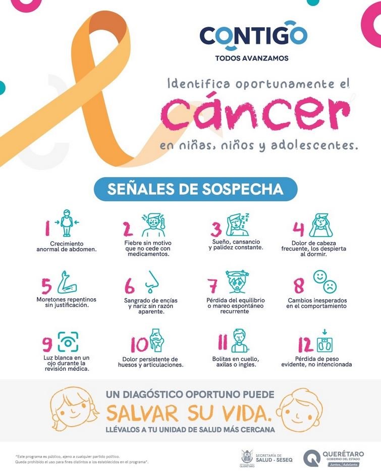 En el estado de Querétaro, el Hospital de Especialidades del Niño y la Mujer “Felipe Núñez Lara” brinda atención y tratamiento a través del equipo multidisciplinario a niñas, niños y a población adolescente que son diagnosticados con cáncer. Para más información acudir al Centro de Salud.