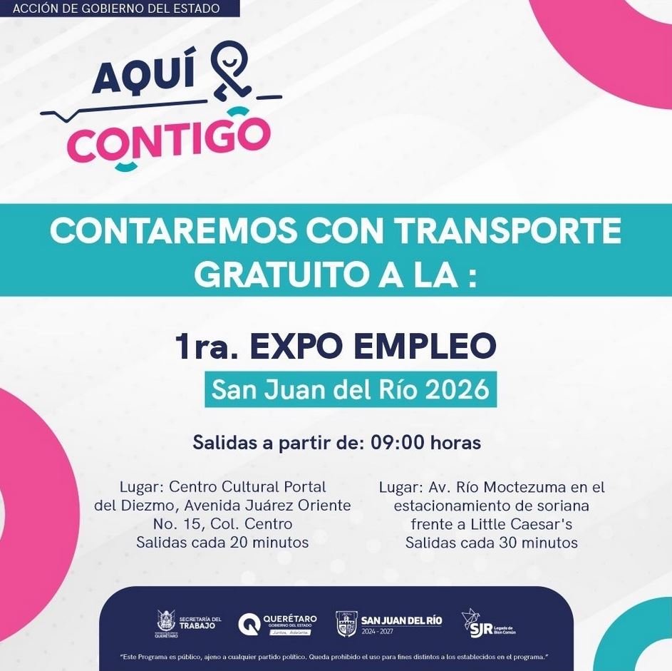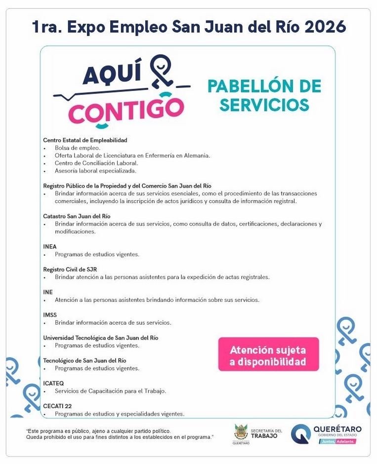 Interesadas e interesados pueden acceder también a un pabellón de servicios integrado por la Unidad Móvil del Centro de Conciliación Laboral; así como Registro Civil, Catastro, Registro Público de la Propiedad, INEA, entre otros, además de instituciones educativas como la Universidad Tecnológica (UTSJR) y el Tecnológico de San Juan del Río, ofreciendo también transporte gratuito desde el Centro Cultural Portal del Diezmo y Avenida Río Moctezuma (frente a Soriana), y el registro previo puede realizarse en: https://forms.gle/EhbGinqZETtx6zSXA.
