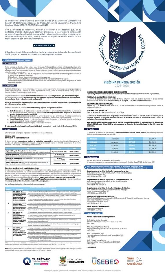 Con el propósito de mantener a Querétaro como un referente de calidad educativa y en reconocimiento al trabajo de sus maestras y maestros, la coordinadora general de la Unidad de Servicios para la Educación Básica en el Estado de Querétaro (USEBEQ), Irene Quintanar Mejía, y el secretario general de la sección 24 del Sindicato Nacional de Trabajadores de la Educación (SNTE), Francisco Ramírez Labra, dieron a conocer las bases de la convocatoria de la vigésima primera edición del Premio Estatal al Desempeño Profesional Docente (PEDPD) 2025-2026.