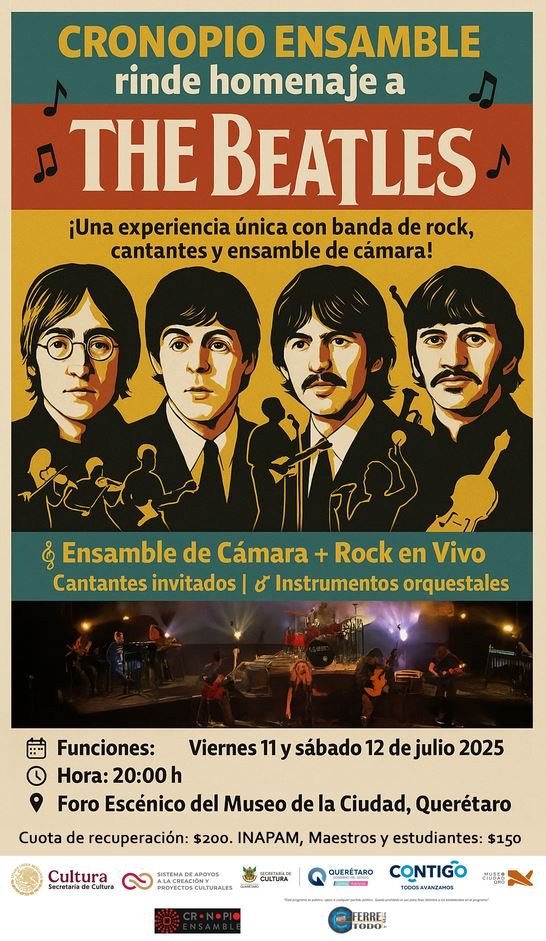 El Museo de la Ciudad de Querétaro, de la Secretaría de Cultura del estado, será escenario para el Homenaje a los Beatles que Cronopio Ensamble ofrecerá los días viernes 11 y sábado 12 de julio, veladas que prometen ser una celebración respetuosa, renovada y luminosa de la música del cuarteto de Liverpool, fenómeno cultural y artístico que sigue vigente.