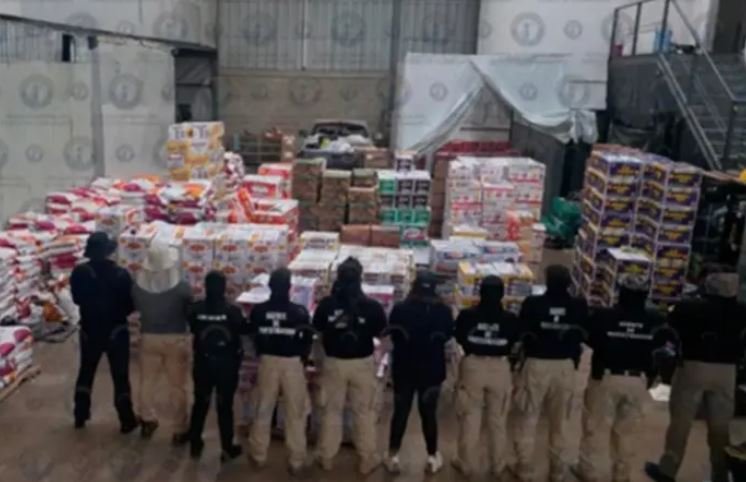 La Fiscalía General del Estado dio a conocer que, tras ejecutar un cateo, se aseguraron grandes cantidades de insumos industriales y productos comerciales, entre ellos más de mil costales de materia prima destinada a la panificación, así como cajas y contenedores con rellenos frutales, artículos de confitería, dulces y alimento procesado para mascotas.