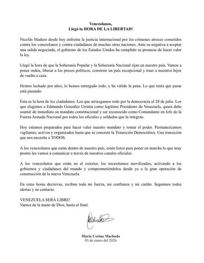 A través de un comunicado difundido en sus redes sociales, Machado —galardonada con el Premio Nobel de la Paz 2025— sostuvo que Maduro enfrenta ahora a la justicia internacional por presuntos crímenes cometidos contra la población venezolana y ciudadanos de otros países. Señaló que, tras negarse a aceptar una salida negociada, Estados Unidos habría cumplido su promesa de hacer valer la ley.