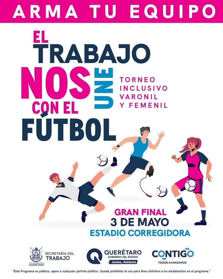 La Secretaría del Trabajo (ST) invita al primer Torneo de Fútbol Regional “El Trabajo Nos Une”, el cual contempla la participación de 80 equipos en ramas femenil y varonil, donde además se promueve la inclusión de personas con discapacidad como parte de los equipos, fortaleciendo un espacio accesible para todas y todos; mediante partidos se llevarán a cabo durante el mes de abril y culminarán el 3 de mayo con la gran final en el Estadio Corregidora.
