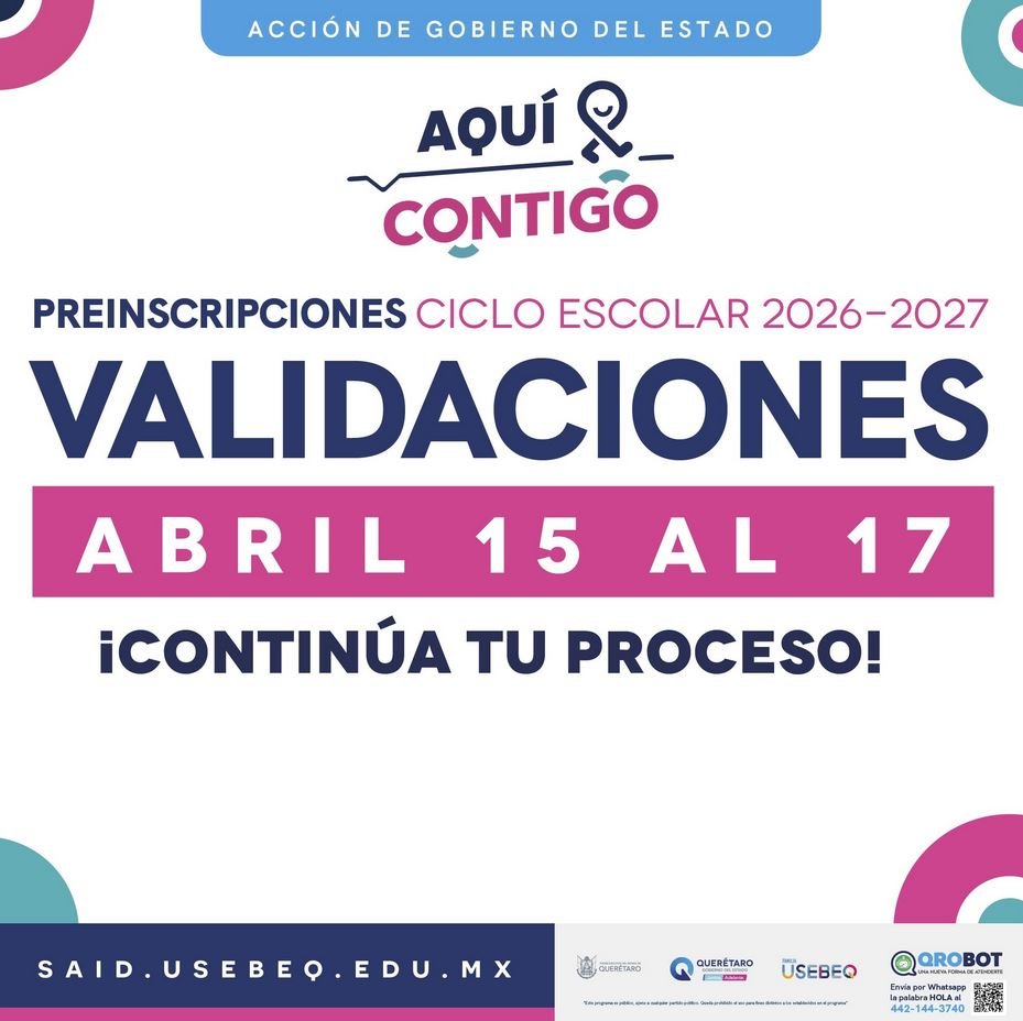 La Unidad de Servicios para la Educación Básica en el Estado de Querétaro (USEBEQ), recuerda que del 15 al 17 de abril las madres, padres de familia o tutores pueden validar y aceptar en la página said.usebeq.edu.mx los resultados que corresponden a la distribución de los espacios para las y los estudiantes de nuevo ingreso a 2º y 3º de preescolar, así como las y los aspirantes a 1º de primaria y secundaria que optaron por participar en una segunda asignación al rechazar su preasignación durante el proceso de preinscripciones para el ciclo escolar 2026-2027.