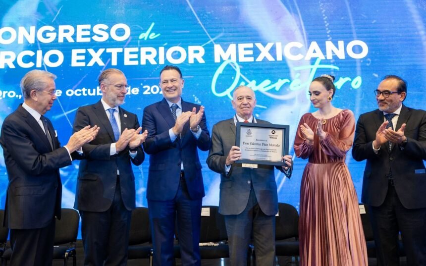 El presidente honorario del COMCE, Valentín Díez Morodo, quien recibió un reconocimiento por su trayectoria y esfuerzos en beneficio del país, compartió que este año el Congreso dedica un espacio muy especial al encuentro de negocios Hecho en México con Calidad, para reconocer la contribución e impulsar nuevas oportunidades de desarrollo internacional. En este tenor, afirmó que Querétaro ofrece el marco ideal para reflexionar sobre esta nueva etapa del comercio internacional.