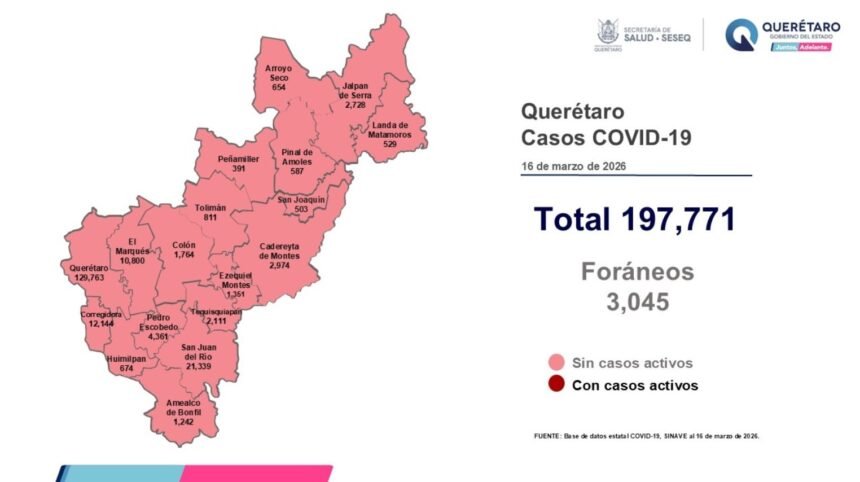 La Secretaría de Salud de Querétaro reportó este lunes cero defunciones por COVID-19, y que en los últimos siete días no se han sumado casos de la enfermedad en el estado. El registro acumulado es de 197 mil 771 casos: 54 por ciento son mujeres y 46 por ciento son hombres.