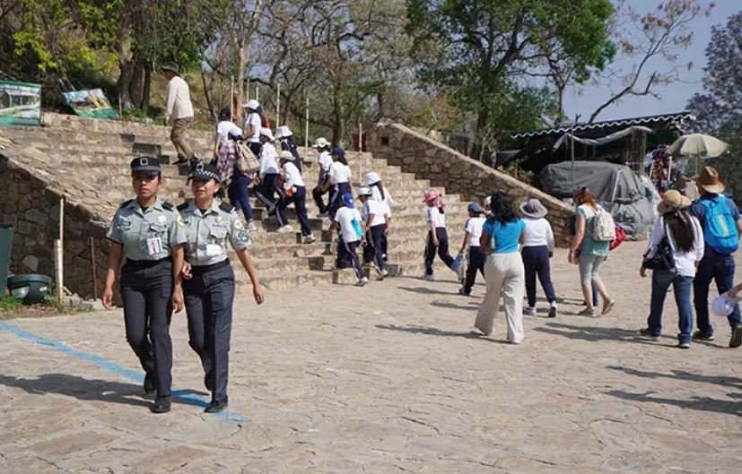 Dentro del recinto, agentes de la Guardia Nacional realizan patrullajes constantes en parejas por la plaza principal. Según autoridades del lugar, se determinó que fueran mujeres quienes encabezaran este refuerzo para generar mayor confianza entre los turistas.