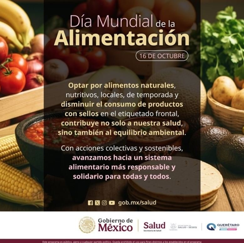 La Secretaría de Salud (SESA) del Estado de Querétaro se suma a la conmemoración del Día Mundial de la Alimentación, cada 16 de octubre, una fecha promovida por la Organización de las Naciones Unidas para la Agricultura y la Alimentación (FAO). El lema para 2025 es “Mano a mano por unos alimentos y un futuro mejores”.