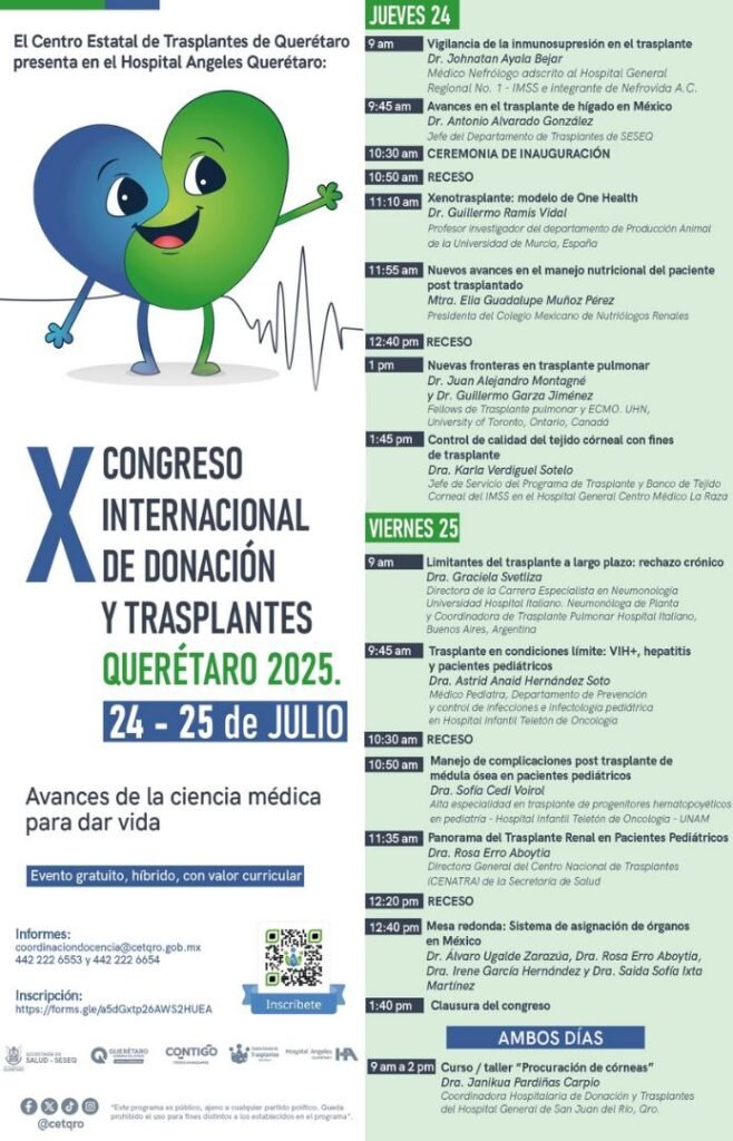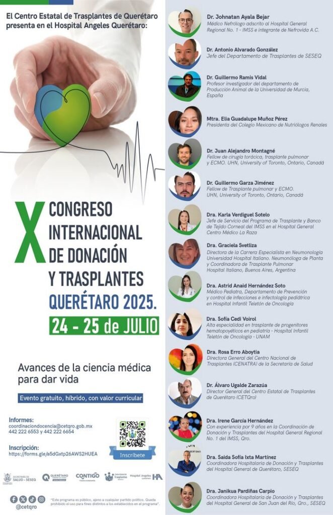 La Secretaría de Salud (SESA), a través del Centro Estatal de Trasplantes de Querétaro, convoca a las y los profesionales y estudiantes de las áreas de Medicina, Enfermería, Nutrición, Fisioterapia, Psicología y disciplinas afines a participar en el “X Congreso Internacional de Donación y Trasplantes Querétaro 2025, que se llevará a cabo bajo el lema “Avances de la ciencia médica para dar vida”.