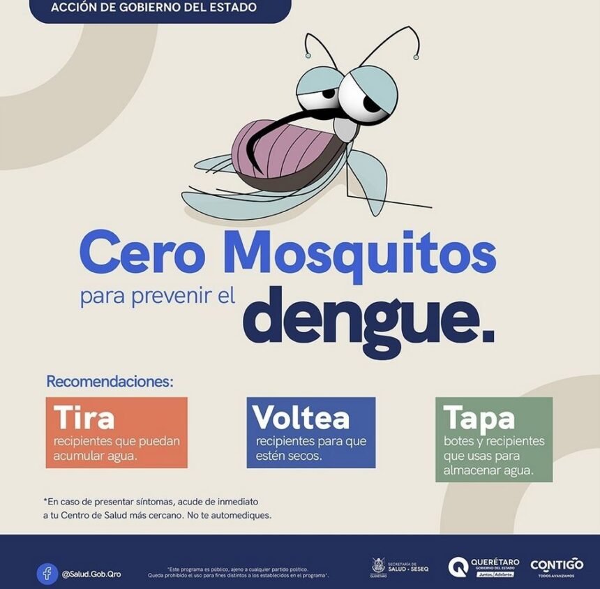 La Secretaría de Salud (SESA) del estado de Querétaro, exhorta a la población a adoptar y reforzar las medidas preventivas ante el incremento en el número de casos de dengue en México. Es fundamental eliminar todo tipo de criaderos de mosquitos, protegerse de las picaduras y solicitar atención médica oportuna en caso de presentar síntomas.