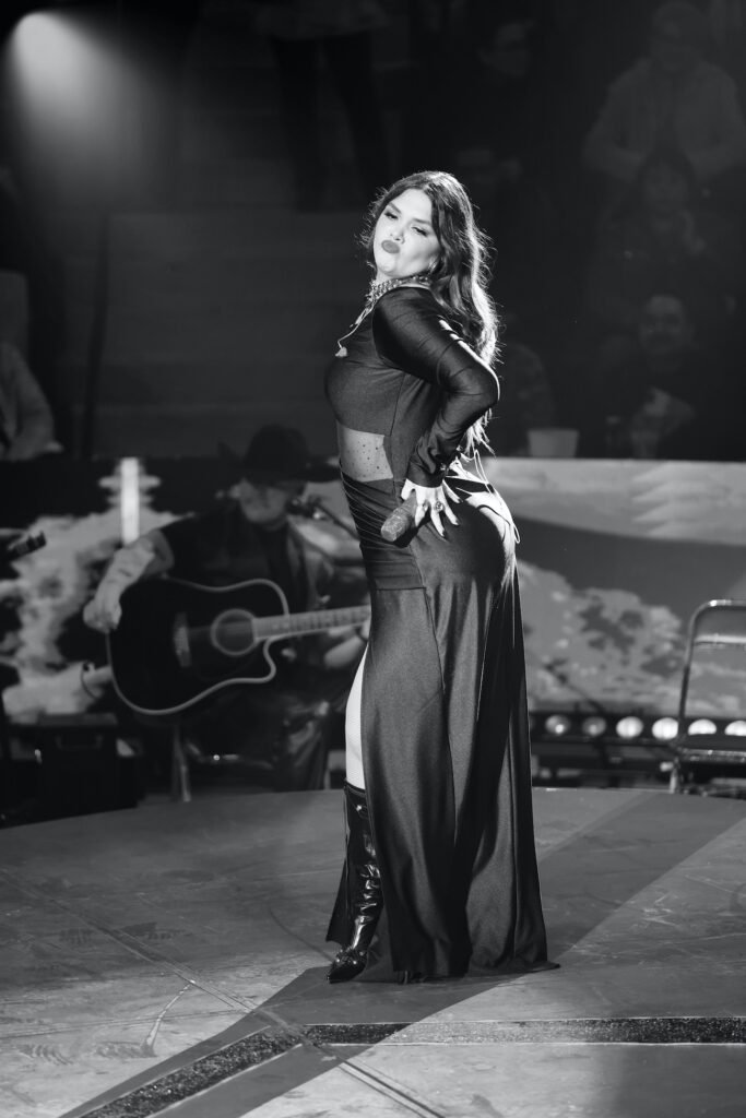 En punto de las 23:00 horas, la cantante sonorense apareció en el escenario, dominado por un corazón rojo, para abrir la velada con No son horas y Malamente.